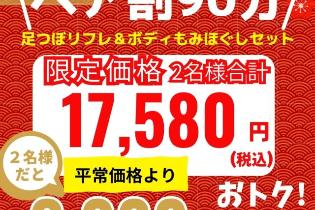 1/31まで!【お得なペア割90分!2,000円OFF】足つぼ&ボディセット一人様⇒8,790円(税