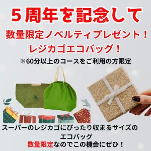 【樂乃森5周年記念感謝コース】ボディ&足つぼ100分 2026/02/01 【樂乃森5周年記念感謝コース】ボディ&足つぼ100分⇒9,900円(税込) 2月で樂乃森は5周年を迎えることができました。 感謝の気持ちを込めて、当店一番人気ボディ&足つぼ100分特別メニューをご用意いたしました。 2/1~2/28の期間中に60分以上のコースをご利用いただいたお客様は、5周年記念エコバックをプレゼントいたします。 これからも心と身体が安らぐ時間をお届けできるよう努めてまいります。