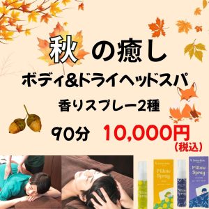 10/1~10/31【秋の癒し】ボディ&ドライヘッドスパ90分(香りスプレー付き) 2025/10/01 10/1~10/31【秋の癒し】ボディ&ドライヘッドスパ90分(香りスプレー付き)→10,000円(税込) 秋は睡眠の質が落ちやすくなります。 ボディもみほぐしで自律神経のバランスを整え、ドライヘッドスパで睡眠の質を改善、香りスプレーでリラックスして、リフレッシュしませんか?